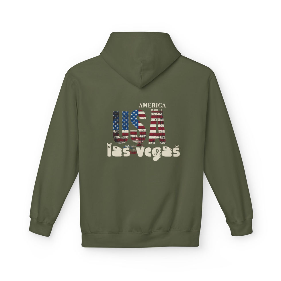 A midweight fleece hoodie that brings a rugged, lived-in patriotism to casual days and late-night drives. The front bears a small, distressed USA graphic, while the back shows a larger, worn-in “USA • Las Vegas” design layered with an American flag texture — it reads like a souvenir reclaimed from road trips and neon nights. The soft, brushed interior and relaxed dropped shoulders make it feel like the hoodie you reach for after a long day exploring or when you want to fold into a quiet evening with friends. Thoughtfully produced with OEKO-TEX and socially conscious certifications, this piece blends vintage Americana style with responsible manufacturing.